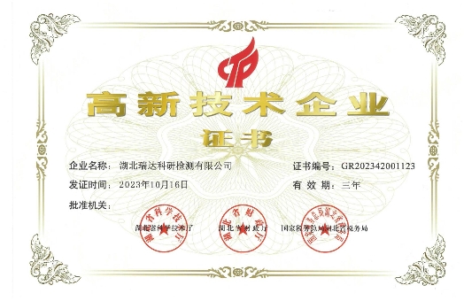 近日,湖北路橋瑞達檢測公司收到由湖北省科學技術廳、湖北省財政廳、國家稅務總局湖北省稅務局共同頒發的“高新技術企業”證書,這是瑞達檢測公司首次榮獲此項認定,標志著瑞達檢測公司在科技創新和產業升級方面取得了重要突破,正式邁入國家高新技術企業行列。