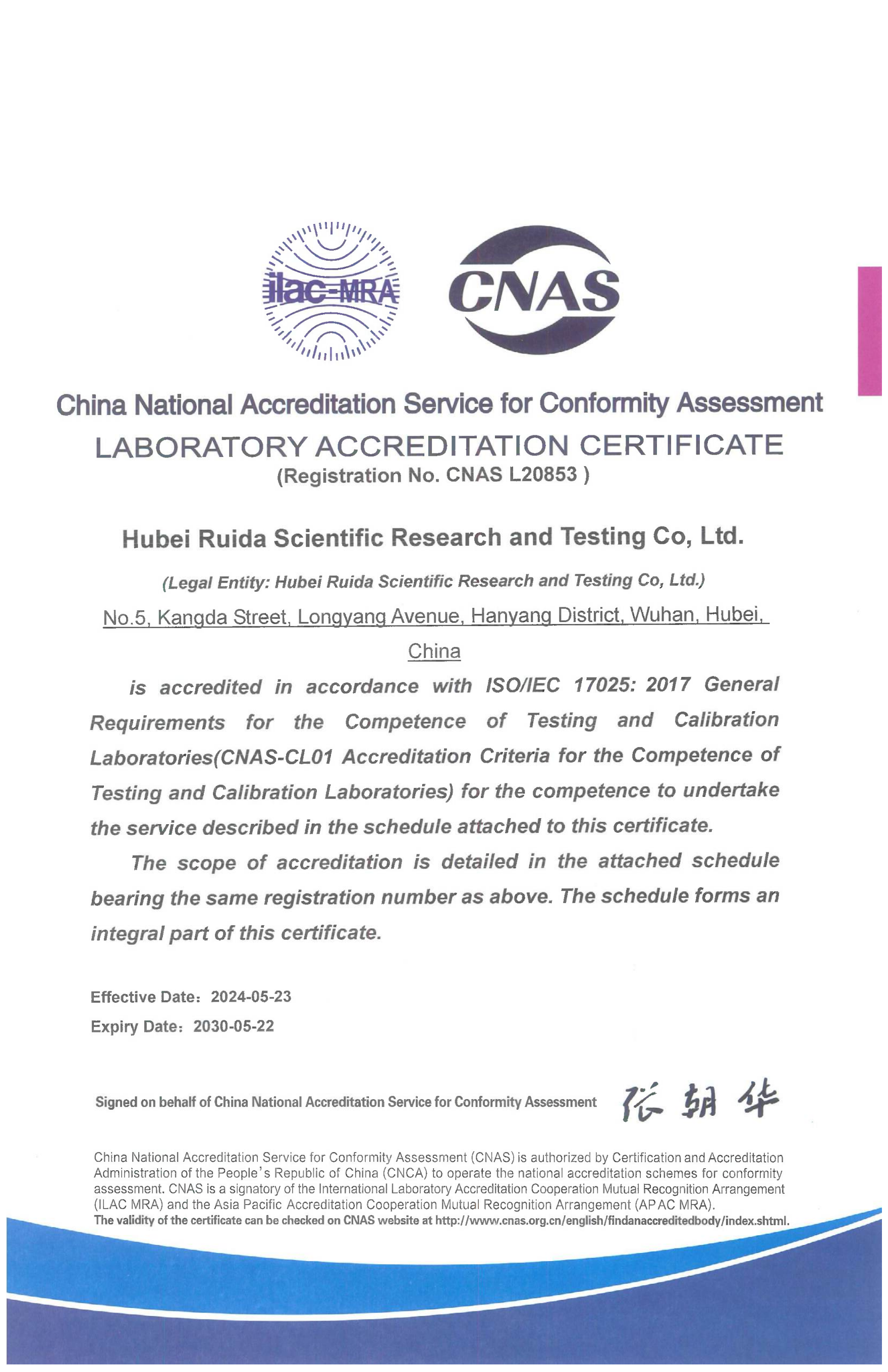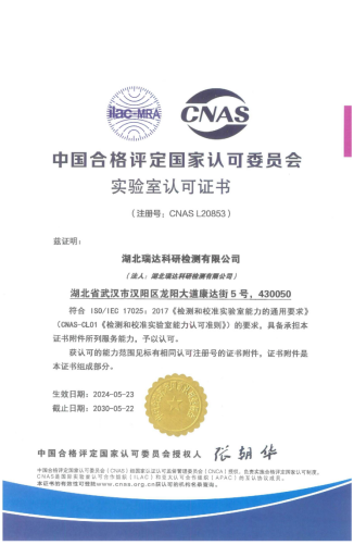 近日,湖北路橋瑞達檢測公司順利通過中國合格評定國家認可委員會(CNAS)各級審核,取得“實驗室認可證書”,標志著湖北路橋瑞達檢測公司首次躋身國家級認可實驗室行列,具備按照有關國際認可準則開展檢測服務的能力。