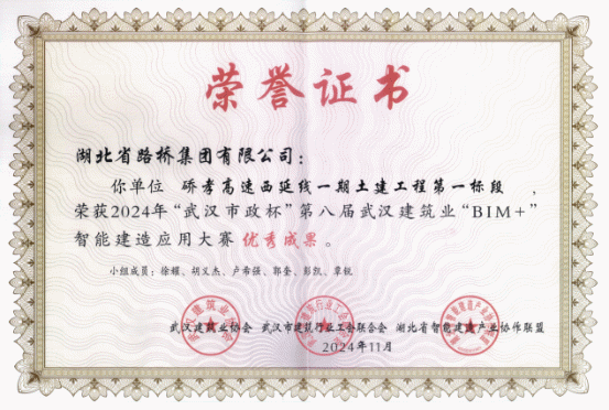 11月8日,由武漢建筑業(yè)協(xié)會(huì)、武漢市建筑工會(huì)聯(lián)合會(huì)、湖北省智能建造產(chǎn)業(yè)協(xié)作聯(lián)盟共同舉辦的2024年“武漢市政杯”第八屆武漢建筑業(yè)“BIM+”智能建造應(yīng)用大賽決賽在武漢舉行,湖北路橋“硚孝高速西延線(xiàn)一期土建工程第一標(biāo)段”BIM應(yīng)用成果榮獲“優(yōu)秀成果獎(jiǎng)”。