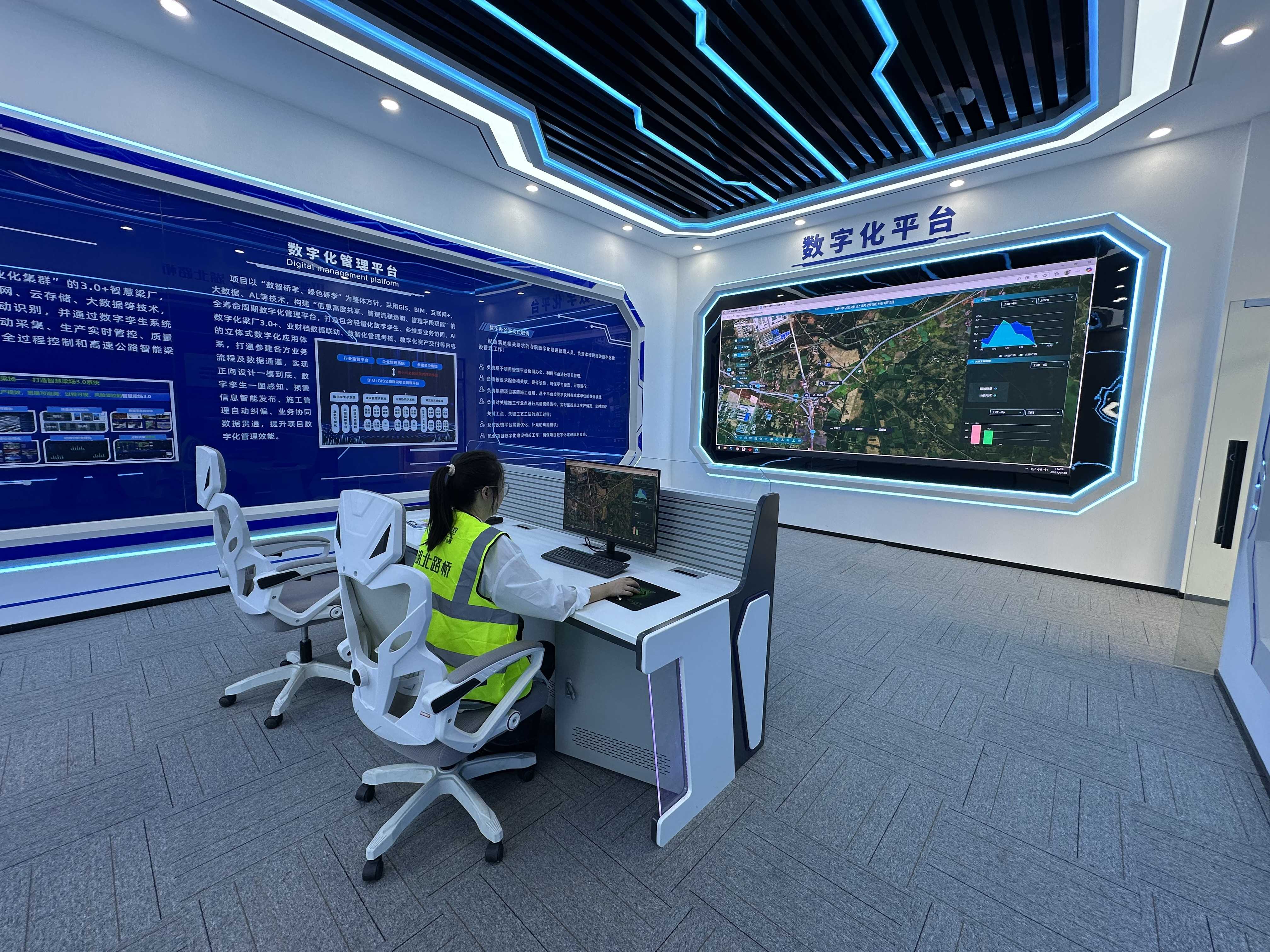 在項(xiàng)目部的數(shù)字化辦公室,電子屏幕上,整個(gè)項(xiàng)目的三維BIM模型清晰可見。項(xiàng)目總工徐耀輕點(diǎn)鼠標(biāo),即可隨意調(diào)取任一工點(diǎn)的實(shí)時(shí)畫面、進(jìn)度數(shù)據(jù)、質(zhì)量檢測報(bào)告等信息。