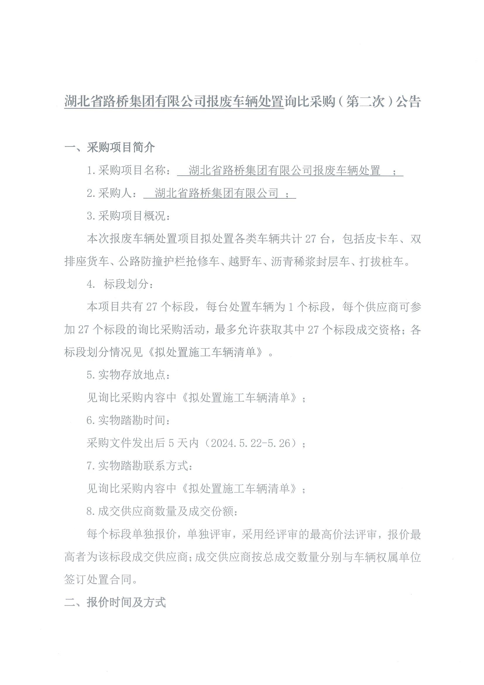 湖北省路橋集團有限公司報廢車輛處置詢比采購(第二次)公告